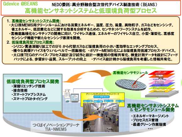 具体的には、低炭素社会づくりに貢献する高機能MEMSセンサおよびそれを活かしたネットワークシステムの構築と、革新的次世代デバイスの実用化における低環境負荷型製造プロセス技術を確立することが急務であるとの認識の下、以下のような研究開発を実施しました。