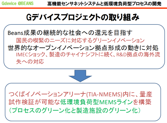 国・NEDO委託の「高機能センサネットシステムと低環境負荷型プロセスの開発」の研究事業(Gデバイス@BEANS)は、技術研究組合BEANS研究所が受託し、「異分野融合型次世代デバイス製造技術開発プロジェクト(BEANSプロジェクト)」(事業期間:2008年度~2012年度)の下で研究開発が行われました。今回の予算措置は2009年度の補正予算に基づくものであるため、実施期間は2009-2010年の2年間(実質1年)となりました。