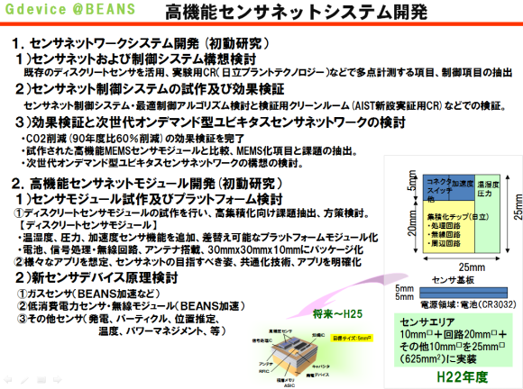 具体的に実施した研究内容を紹介します。まず、「高機能センサーネットシステム開発」です。本研究テーマにおいては、産総研に導入する8インチMEMS製造ラインおよびクリーンルームを対象にしたセンサーネットワークシステムの研究開発を行いました。さらには、様々なアプリを想定してセンターネットに用いられるであろう高機能センサーモジュールの研究開発を進めました。2010年度においては、これらの研究開発の初動研究を行いました。