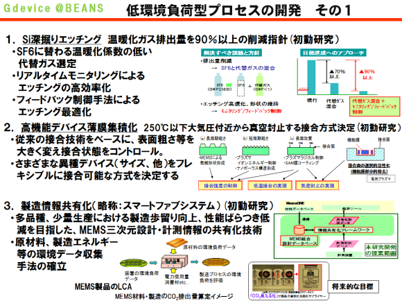 また、MEMS製造ラインのグリーン化を徹底すべく、様々な低環境負荷型プロセスの開発を進めました。具体的には温暖化ガスの排出を極力削減するシリコン深掘りエッチング技術や省エネ型の高機能デバイス薄膜集積化技術の研究開発しました。また、MEMS製造プロセスの環境負荷評価技術にも取り組みました。これらの研究も、2010年度においては初動研究を行いました。