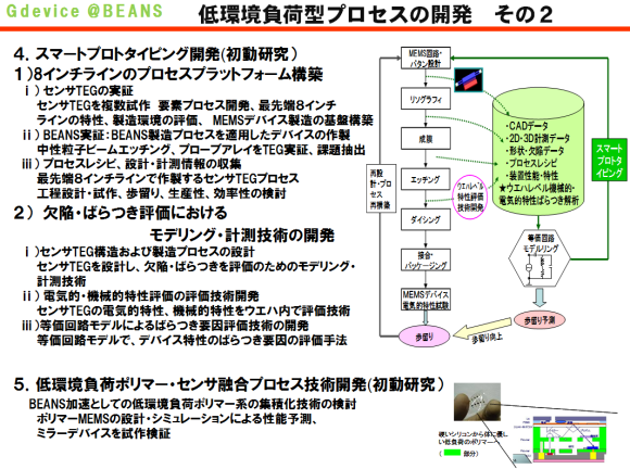 さらなるグリーンプロセス化技術として、一連の製造プロセスの欠陥・ばらつきなどを極小化し高信頼性を確保するためのスマートプロトタイピングの研究開発や、環境に優しいポリマー材料を用いたMEMSデバイスの研究開発に取り組みました。やはりこれらの研究も、2010年度においては初動研究を行いました。