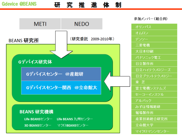 (研究所長:遊佐厚)の中に、Gデバイス@BEANSの研究活動を統括するための組織として、従来のBEANS研究機構とは別にGデバイス研究体(研究体長:前田龍太郎(産総研集積マイクロシステム研究センター長))を設けました。さらに実際の研究活動は、つくばの産業技術総合研究所内(