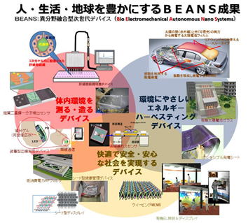 BEANSとは、MEMS技術とナノ・バイオ技術が融合し、自律的に機能する異分野融合型デバイスの総称です。BEANSプロジェクトは、経済産業省の主導のもと、独立行政法人新エネルギー・産業技術総合開発機構(NEDO)から技術研究組合BEANS研究所が委託を受け、企業、大学、独立行政法人産業技術総合研究所の研究者を結集し、産学連携体制のもとで実施しました(平成20年度~24年度の5年間)。