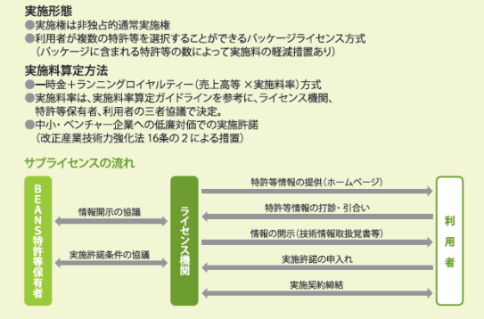 BEANSプロジェクト成果である特許等の利用を希望する方は、BEANSパテントショップを通じて様々な特許のサブライセンス供与を受けることができます。