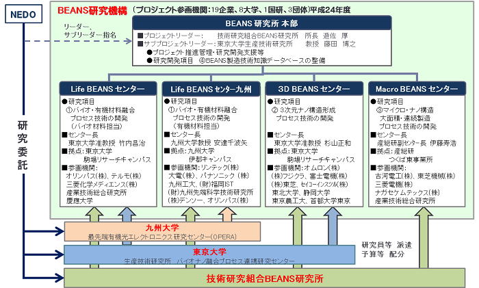 プロジェクト推進にあたっては、各企業や産総研などが組合員として参加した技術研究組合BEANS研究所が中心となり、さらに東京大学や九州大学が加わった産学連携のコンソーシアム(BEANS研究機構)を結成しました。またBEANS研究所においては、本部を始め各研究テーマに対応したLife-BEANSセンター、Life-EANSセンター九州、3D-BEANSセンター、Macro-BEANSセンターを設置し、最も効率的な研究体制を構築しました。