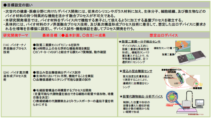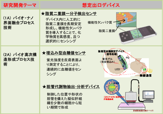 バイオ材料融合プロセス技術の研究開発成果です。今後、脂質二重膜一分子検出センサ、埋込み型血糖値センサ、胆管代謝物抽出・分析デバイスなどの実用化につながることが期待されます。