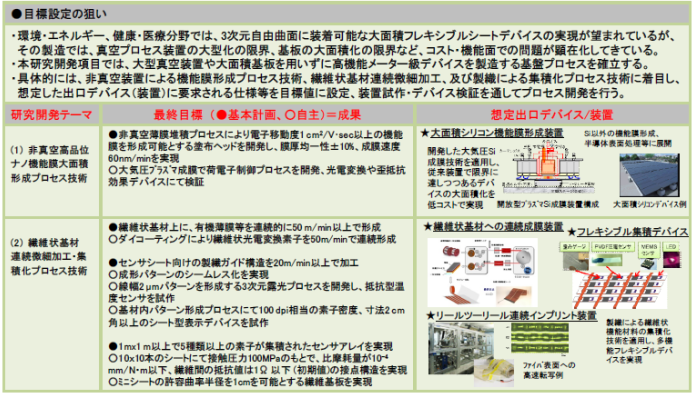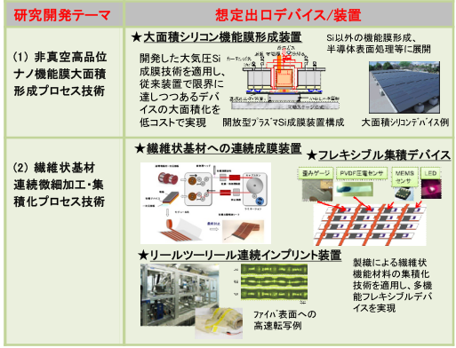 マイクロ・ナノ構造大面積・連続製造プロセス技術の研究開発成果です。今後、大面積シリコン機能膜形成装置、繊維状基材への連続成膜装置、リールツーリール連続インプリント装置、フレキシブル集積デバイスなどの実用化につながることが期待されます。