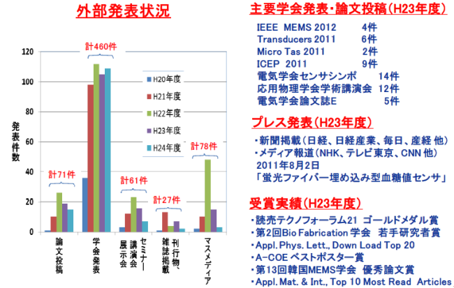 プロジェクト成果の外部発表状況を取りまとめました。論文投稿71件、学会発表460件、セミナー61件、雑誌掲載・刊行物27件、マスメディア78件と多数の外部発表が行われました。