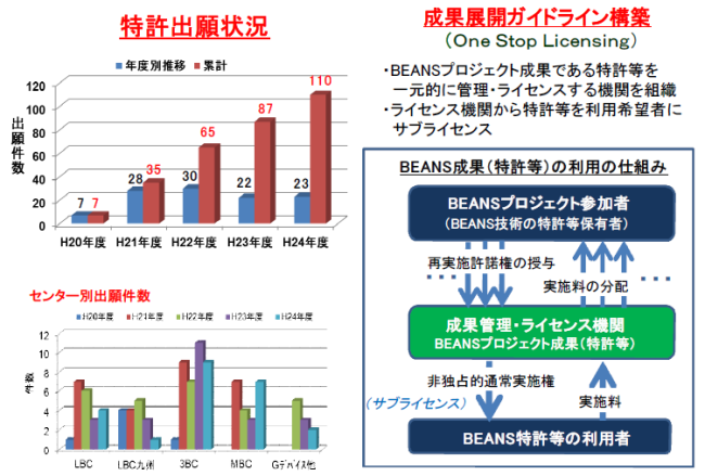 BEANSプロジェクトにおいて、110件もの特許出願がなされました。今後、これらのBEANSプロジェクト成果である特許については、一元的に管理・ライセンスする機関(BEANSパテントショップ)を用意し、利用希望者にサブライセンス供与をすることにしています。