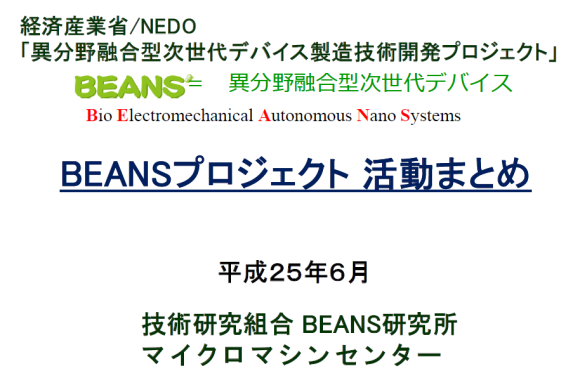 MEMS技術とナノテクノロジー、バイオテクノロジー等の異分野技術を融合させ革新的次世代デバイス (BEANS) の創出に必要な基盤的プロセス技術群を開発し、次なるイノベーションのためのプラットフォームを確立することを目指し、2008年から5年間に亘り遂行された異分野融合型次世代デバイス製造技術開発プロジェクト (BEANSプロジェクト) の活動をまとめました。