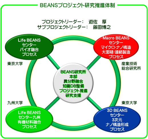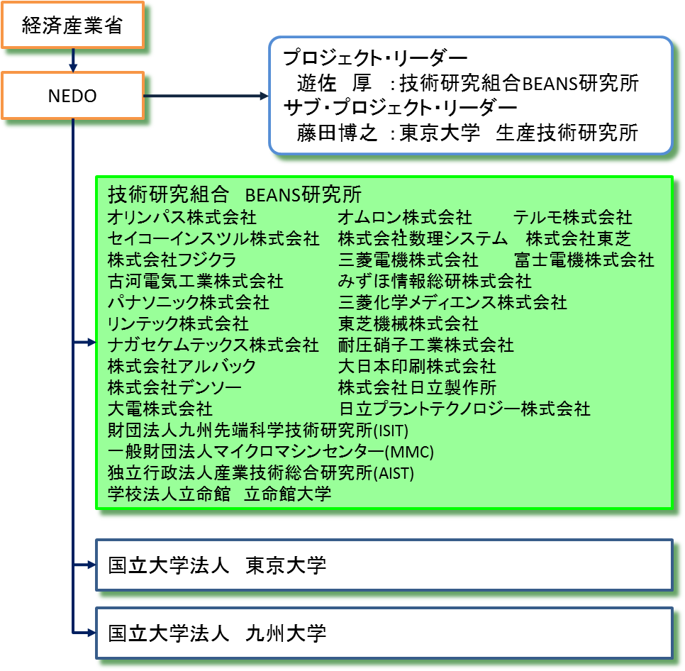 プロジェクト推進母体としてのBEANS研究所は、東京大学、九州大学、産業技術総合研究所と共同推進体制を築き、経済産業省の指導の下、NEDO技術開発機構から委託を受け、研究開発を実施しています。