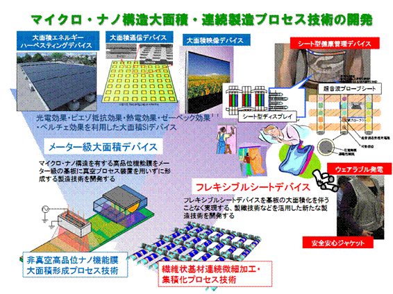 (1)環境・エネルギー、健康・医療分野では、メーター級大面積エネルギーハーベスティングデバイスの大幅な低コスト化とともにマイクロ・ナノ構造搭載に よる高機能化が期待されています。また、ウェアラブル発電、安全安心ジャケット、シート型健康管理デバイス等の3次元自由曲面に装着可能な新形態のフレキ シブルシートデバイスの実現が望まれています。これらの製造に際し、従来の半導体製造装置をベースとした製造技術の延長では、真空プロセス装置の大型化の 限界、基板の大面積化の限界などの問題が顕在化してきています。将来のメーター級大面積デバイスの高機能化、低コスト化のためには、マイクロ・ナノ構造を 有する高品位機能膜をメーター級の基板に真空プロセス装置を用いずに形成する製造技術の創出が必要となります。また、基板の大面積化を伴うことなく、メー ター級のフレキシブルシートデバイスを実現する、製織技術などを活用した新たな製造技術の創出が重要です。