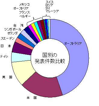 参加者のうちオーストラリアからの参加者は全体の2/3を占めていましたが、発表件数でも下図にありますよう45%を占め、オーストラリアがマイクロ・ナノ・バイオへの取り組みに力を入れていることがうかがえます。日本は米国、英国につぎ、ドイツと並び6件の発表を行い会議における日本およびMEMS協議会のプレゼンスを示すことができました。