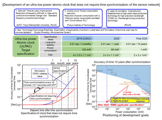 | With the aim to accelerate the research and development of “Research and Development of Road Infrastructure Monitoring System”, “Research and Development of Ultra-Low Power Atomic Clock (ULPAC)” is being promoted from 2015 to 2018. The technical research association “NMEMS Technology Research Organization” is bringing together universities and companies that have been working on developing compact atomic clocks in Japan centered around AIST, which creates high-precision frequencies that control the standard time of the world. Analysis and prototyping will be used to examine the size and power consumption of atomic clocks that show accurate time for installation on sensor terminals, and review the appropriate pricing. |