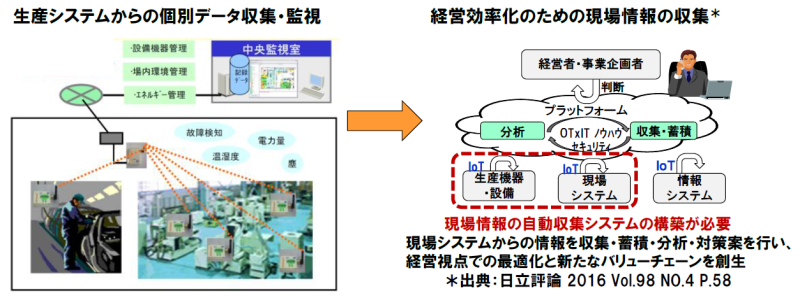 | 産業分野においてIoTを活用した生産効率向上が求められています。すなわち、各種機器の稼動状態や、工場内の製品の流動状態や品質、作業者の作業状況などの現場情報をセンサにより数値化し、インターネットを通じて収集・分析して経営にフィードバックすることで生産効率向上を図ることができます。 |