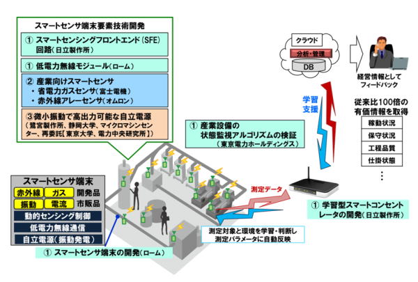 本研究開発では、大規模工場・プラント等の生産・原動設備の稼働状況・生産品質の把握を適切かつ効率的に行うことを目的として、スマートセンサモジュール(ガス、赤外線アレー)、設備の微小振動で連続的な高出力可能な自立電源の開発およびスマートセンシングフロントエンド(SFE)回路の開発を行います。