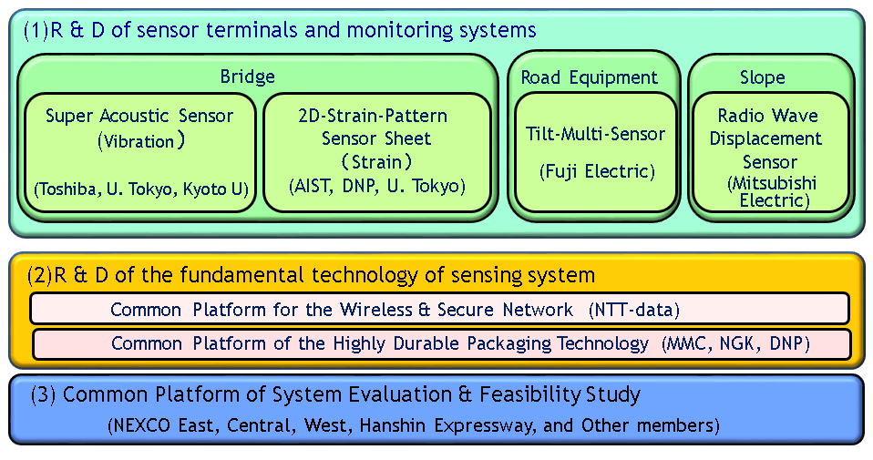 Our system will supplement existing inspection technology, utilizing a wireless sensor network to enable 24-hour continuous and comprehensive knowledge of the status of road infrastructure. It is also suitable for monitoring locations that are difficult to access and responding to sudden phenomena such as disasters. NMEMS will construct a user-participation research system through industry-academia-government collaboration comprising sensor device/system/packaging manufacturers, the National Institute of Advanced Industrial Science and Technology (AIST), universities, expressway companies, and other organizations, with the R&D being conducted over a five-year period beginning this fiscal year. We ask for the kind cooperation and support of everyone involved in this endeavor.