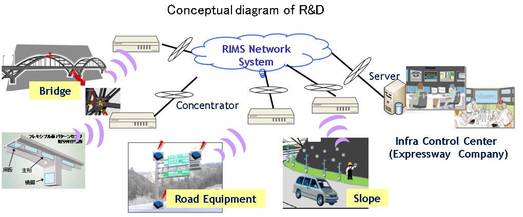 This research is aimed at developing new compact, high-performance, wireless sensor terminals suitable for monitoring the condition of bridges, road equipment, slopes, and targets in other fields. The sensor terminals will be highly efficient, durable, and inexpensive and will employ a stand-alone power supply that harvests ambient energy. These terminals will be used to construct a Road Infrastructure Monitoring System (RIMS) for the total, integrated maintenance of road infrastructure. Development is being streamlined by establishing common platforms for wireless communication networks and highly durable packaging technology.