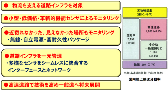 社会インフラの中で陸上貨物輸送量2,655億トンキロの92.3%を占め、国民の豊かな生活を支える道路インフラを対象に、国民生活に与える影響度とその維持管理体制の状況を踏まえ、先ずは高速道路を対象とし、将来的には一般道への展開を目指して、新規の「道路インフラ状態モニタリング用センサシステム」の研究開発を実施する。