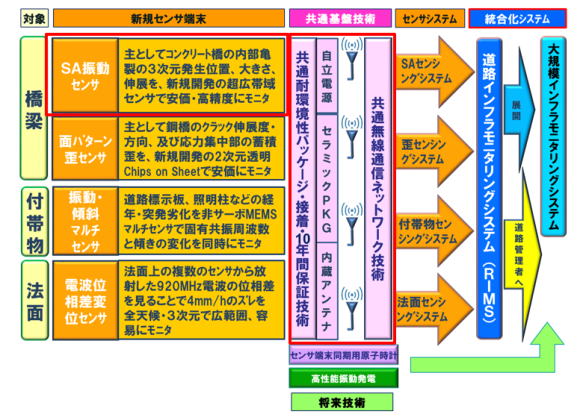 本研究では橋梁、道路付帯物、法面等を対象にして、環境エネルギーを利用した自立電源を有し、各フィールドのモニタリングに適した新規の小型、安価、高性能、高耐久性の無線センサ端末を開発する。無線通信センサネットワークや高耐久性のパッケージングに関しては共通化を図り、効率的な開発を行うとともに道路インフラを統合したトータルな維持管理が可能なシステムを構築する。ユーザー企業(複数の高速道路会社)、センサ企業、通信システム企業、実装企業が連携することにより、道路インフラ全般のニーズに沿ったシステムを開発する。