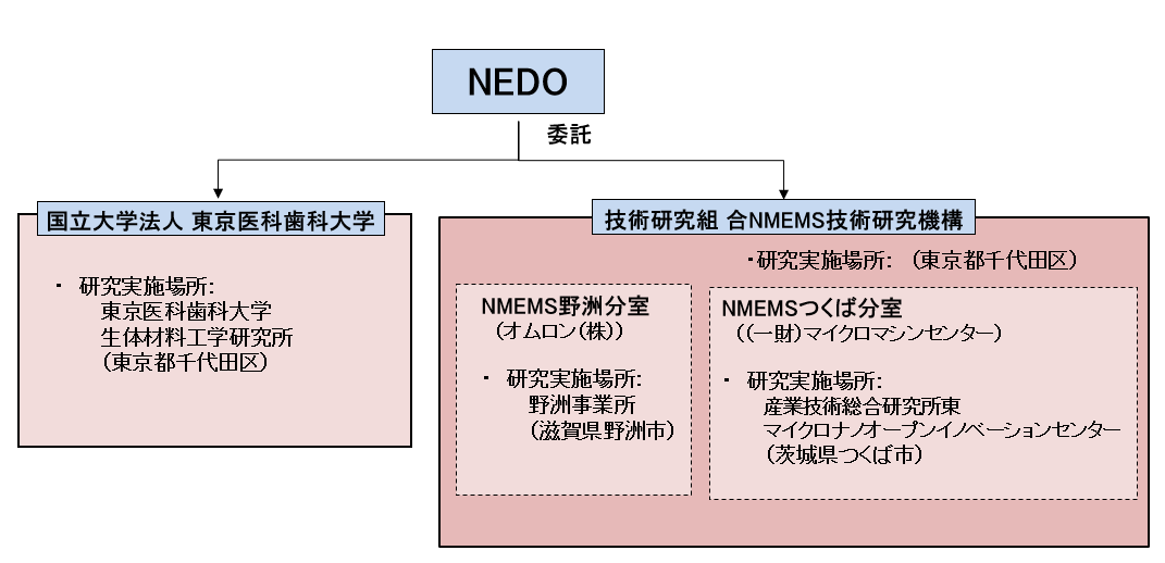 また、プロジェクトの効果的な推進を図るため研究開発責任者である東京医科歯科大学 三林浩二教授のもと推進連絡会を設け、技術検討の深堀り等活発な議論や、参加機関の間で密接な連携を取りつつ、本研究の成果最大化を獲得すべく進めて参ります。なお、一体的に研究開発を推進するための取りまとめはNMEMS技術研究機構が担当します。