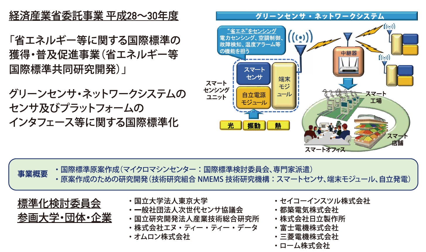 経済産業省の委託事業「エネルギー使用合理化国際標準化推進事業(省エネルギー等国際標準共同研究開発・普及基盤構築/省エネルギー等国際標準共同研究開発)」において、一般財団法人マイクロマシンセンターと技術研究組合NMEMS技術研究機構が共同で提案した「グリーンセンサ・ネットワークシステムのセンサ及びプラットフォームのインタフェース等に関する国際標準化」の研究テーマが採択されました(開発期間:2016年度~2018年度の3年間)。