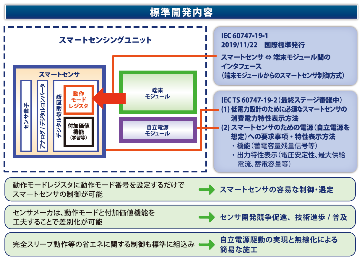スマートセンサと端末モジュール間または自立電源と端末モジュール間のソフト的な接続法については標準が存在しないため、センサメーカーをはじめ端末メーカーやシステムインテグレータ等が製品開発・システム開発の都度、相当な時間・費用掛けて独自のインタフェース作製を行わざるを得ない場合が多く、大きな開発負担となっています。インタフェース部分を標準化することで、開発期間短縮による効率化、開発費用の削減が図れ、メーカー等の開発負担も軽減され、高品質な製品・システムが迅速かつ大量安価に市場に供給されることが期待できます。また、当該ビジネスへの参入者増大によりスマートセンシング&ネットワーク産業の更なる発展・拡大を見込むことができます。