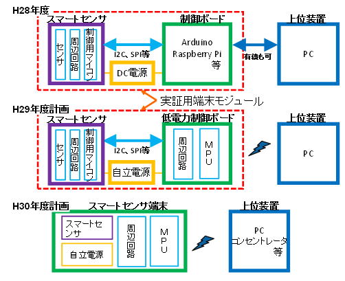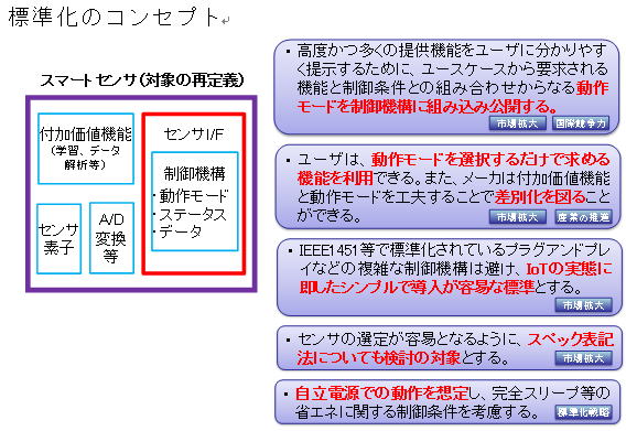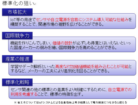 本事業では、SSI規格の構成要素となるスマートセンサ及び自立電源のスペック表示法、スマートセンサが備えるべきハード的要件であるインタフェース仕様等の国際規格原案を作成し、事業期間内にIEC等へ新規提案を実施します。並行して、規格の有効性や技術的裏付け等の検証を行うため、標準的センサドライバや本ドライバを組み込んだ端末モジュール等の試作や接続評価等を実施する。SSI規格の国際標準化により、開発期間の短縮や費用低減に加え、自立電源で駆動する高品質なセンサネットワークシステムの普及を促進する事で、工場・店舗・オフィス等での省エネルギー化に貢献します。