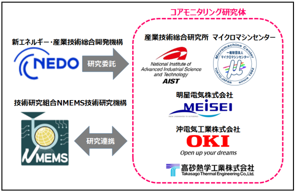 すなわち、新エネルギー・産業技術総合開発機構(NEDO)から研究を受託する一般財団法人マイクロマシンセンター、産業技術総合研究所、明星電気株式会社、沖電気株式会社および高砂熱学工業株式会社ははコアモニタリング研究体を結成し、NEDOの指導に基づき一体的に研究開発を進めます。