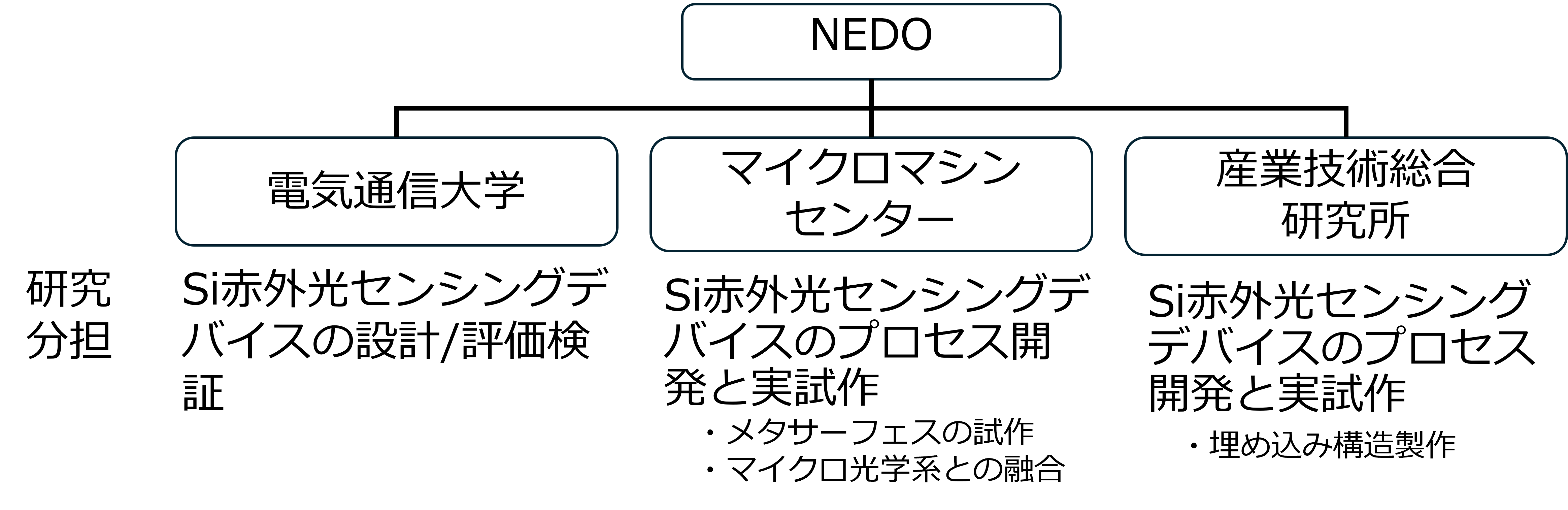 NEDO委託事業「NEDO先導研究プログラム/未踏チャレンジ」の下で、国立大学法人電気通信大学、国立研究開発法人産業技術総技術総合研究所が共同で提案した「メタサーフェスSiハイパースペクトル赤外光センシングデバイス」に取り組んでいます。