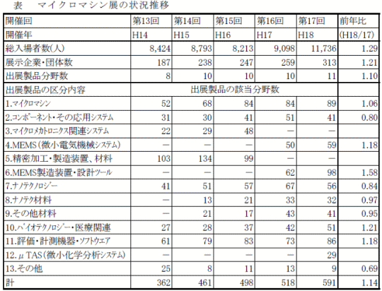 マイクロマシン展(現在のマイクロマシン/MEMS展)は、当初マイクロマシン技術の国内での認知度を上げるため、およびプロジェクトの成果を公表、宣伝するために平成2年(1990 年)からスタートし、以降毎年、(財)マイクロマシンセンターの主催で開催されてきた。平成18 年は第17 回目になるが年々活況を呈している。