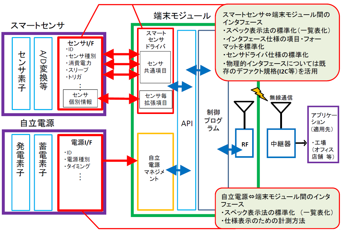 スマートセンサと端末モジュール間または自立電源と端末モジュール間のソフト的な接続法については標準が存在しないため、センサメーカーをはじめ端末メーカーやシステムインテグレータ等が製品開発・システム開発の都度、相当な時間・費用掛けて独自のインタフェース作製を行わざるを得ない場合が多く、大きな開発負担となっています。インタフェース部分を標準化することで、開発期間短縮による効率化、開発費用の削減が図れ、メーカー等の開発負担も軽減され、高品質な製品・システムが迅速かつ大量安価に市場に供給されることが期待できます。また、当該ビジネスへの参入者増大によりスマートセンシング&ネットワーク産業の更なる発展・拡大を見込むことができます。